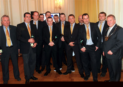 Wie jedes Jahr empfing auch in diesem Jahr OberbĂĽrgermeister Buchhorn die erfolgreichen Leverkusener Sportler. Neben zahlreichen Welt- und Europameistern wurde unser Team, stellvertretend fĂĽr die vielen Deutschen Meister aus Leverkusen, im Spiegelsaal des Schloss Morsbroich fĂĽr den errungenen Deutschen Meistertitel geehrt und durfte sich in das Goldene Buch der Stadt Leverkusen eintragen.